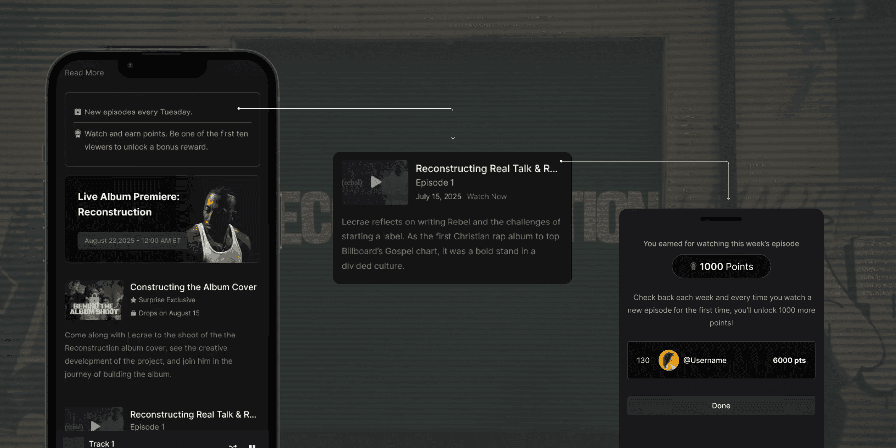 1. Long-Form Vlogs (Powered by Gamification) Released narrative videos where Lecrae discussed album themes. Each view earned points. Fans didn't just watch—they watched all the way through and returned for each release. This proved that attention isn't broken when you provide context + meaningful motivation.