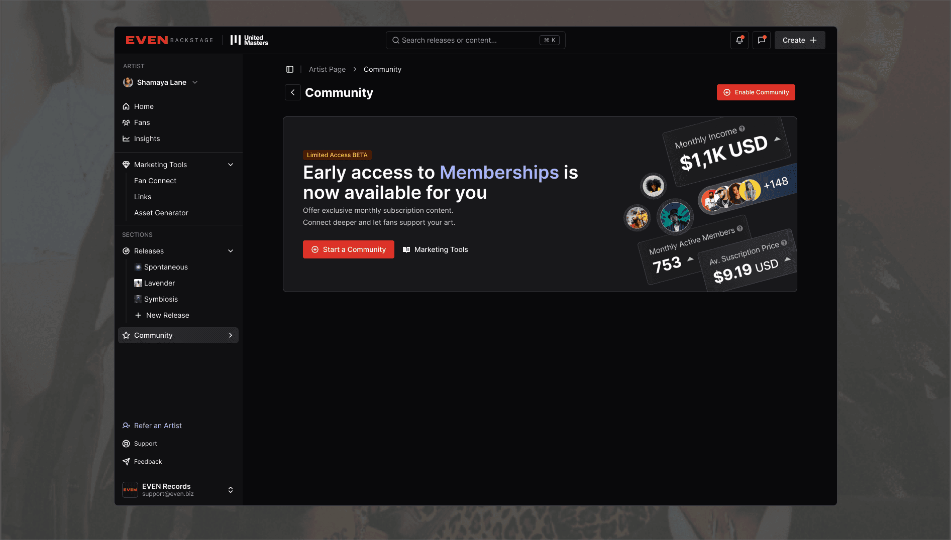 ✅ 15 artists launched memberships (40% growth expected; active waitlist) ✅25% adoption rate among artists offered the feature ✅ Recurring revenue infrastructure established, EVEN now generates MRR beyond two-week Release windows ✅ Platform retention improved, members visit regularly vs. transactional one-time buyers