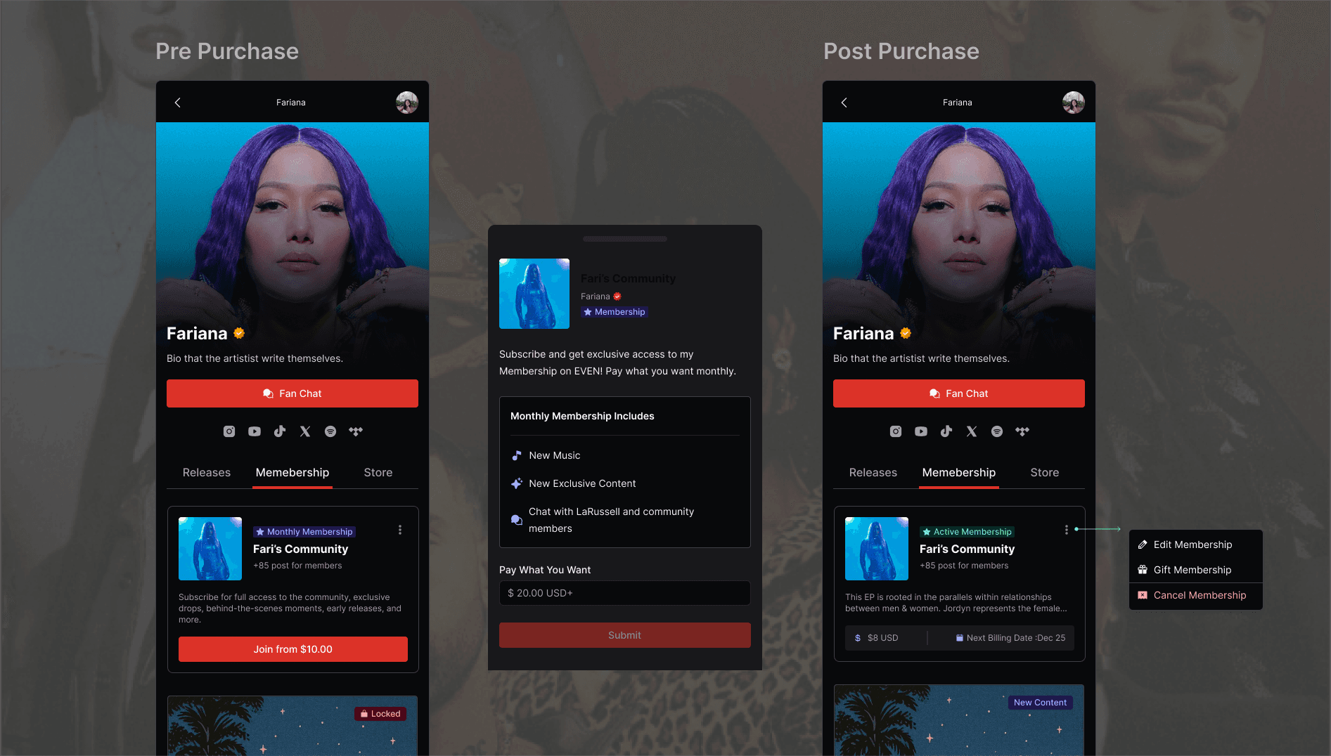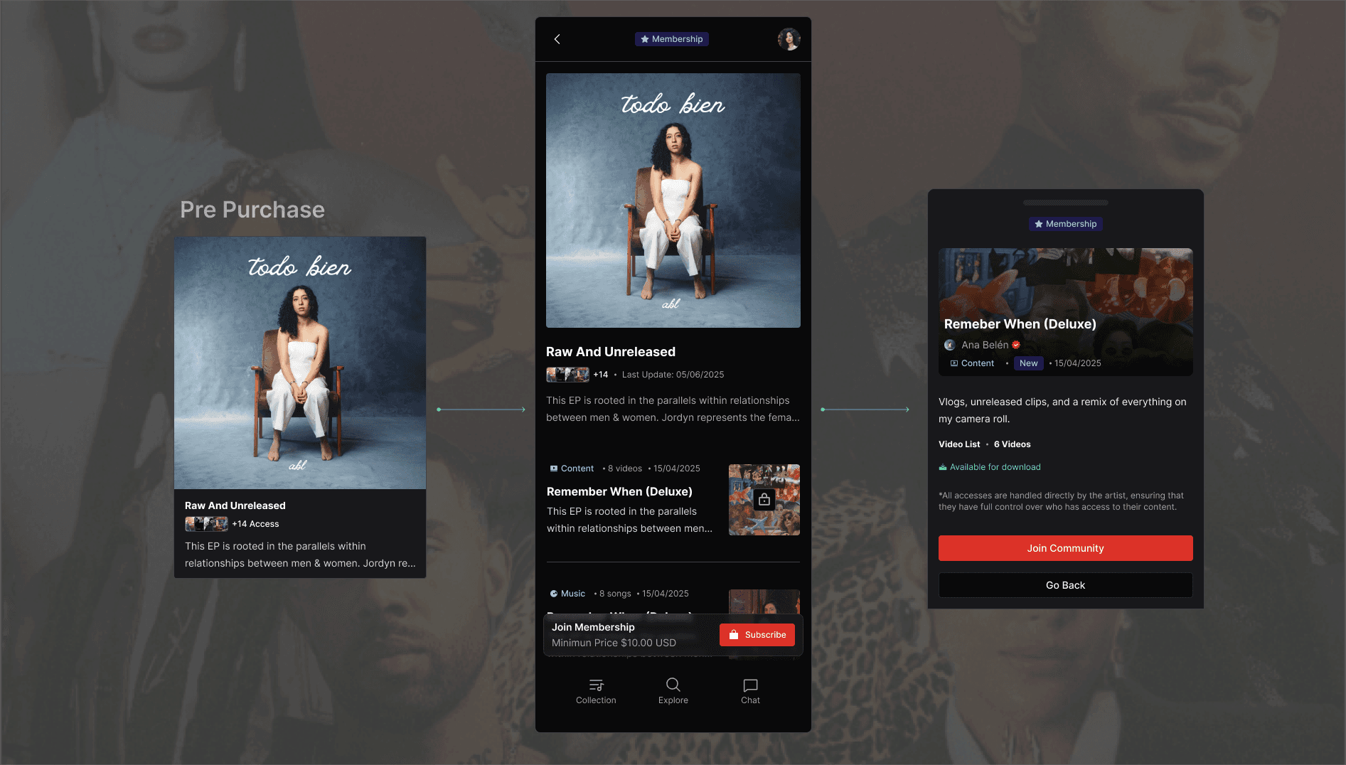 2. Pre-Purchase Conversion Flow We designed intent-driven surfaces before checkout: showing fans what they'd unlock, highlighting artist messaging, and surfacing social proof (e.g., "Join 200 fans supporting [Artist]"). This wasn't just UI — it was psychological reframing: membership as community participation, not transaction. Result: 22% of fans who visited a membership page converted.
