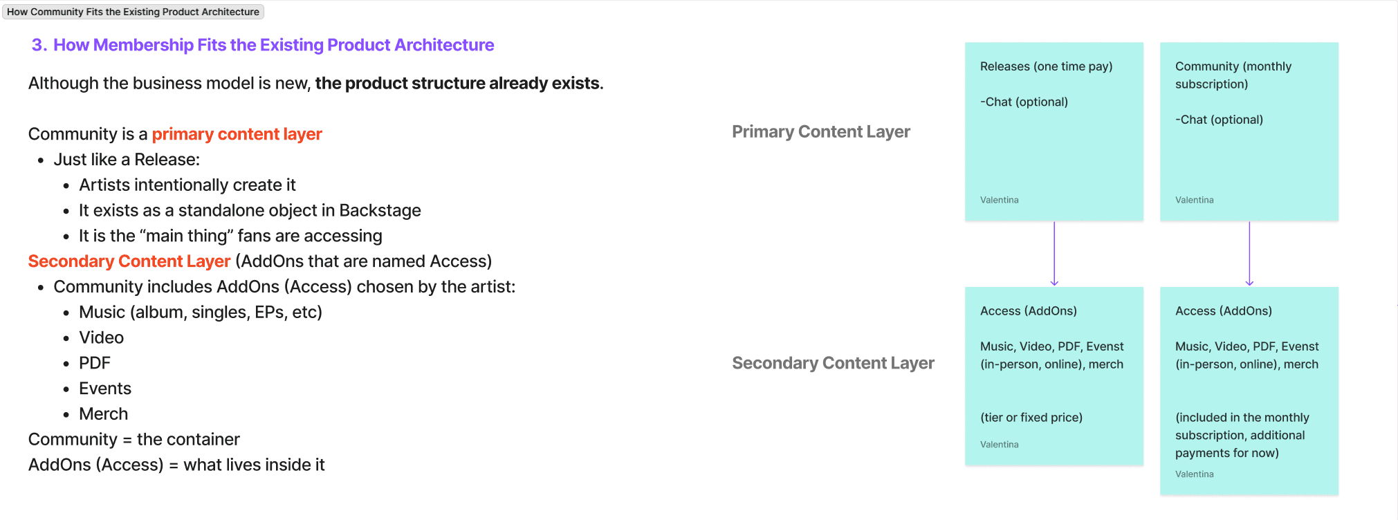 1. Relationship Infrastructure, Not Paywalls Membership should feel like joining something, not buying access. Design for belonging, proximity, and identity — not discounts. 2. Reduce Creator Cognitive Load Artists are musicians, not product managers. Tools must be intuitive, self-service, and require minimal ongoing effort to maintain communities. 3. Access Over Consumption Fans value closeness to artists more than passive content. Design for intimacy, early access, creative process visibility, and recognition.